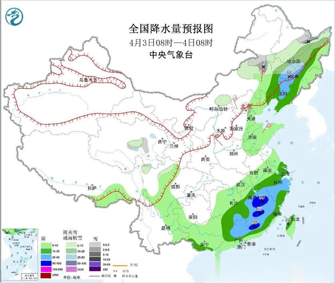 4月3日08时至4日08时,内蒙古中东部、黑龙江中北部、吉林西部、青海中部、川西高原北部等地部分地区有小到中雪或雨夹雪,其中,内蒙古东部、黑龙江北部等地部分地区有大雪(5至7毫米)。黑龙江东部、吉林中部、辽宁、江苏南部、上海、浙江、安徽南部、江西、湖南南部、福建、广东中北部、广西东北部和南部、台湾岛西部等地部分地区有中到大雨,其中,江西东部、福建西部、广东东北部等地部分地区有暴雨(50至90毫米)。内蒙古中西部、华北、西北地区东北部及山东北部等地部分地区有4至6级风、阵风7至9级,内蒙古中部、山西北部、河北北部、北京西部等地局地阵风可达10级以上;渤海、渤海海峡、东海大部海域、台湾海峡、台湾以东洋面将有7至8级风、阵风9级,其中,渤海、东海北部、台湾海峡部分海域风力可达9级、阵风10级。