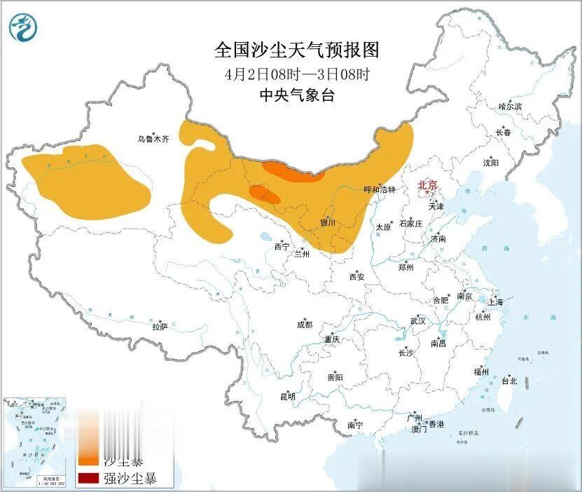 中央气象台4月2日06时继续发布大风蓝色预警和沙尘暴蓝色预警。预计4月2日08时至3日08时,新疆东部和南疆盆地、内蒙古大部、甘肃中西部、宁夏北部、青海大部、西藏北部、云南东部等地部分地区有4至6级风、阵风7级,内蒙古中西部、甘肃河西、西藏北部、青海北部等地部分地区有7至8级风、阵风9级。