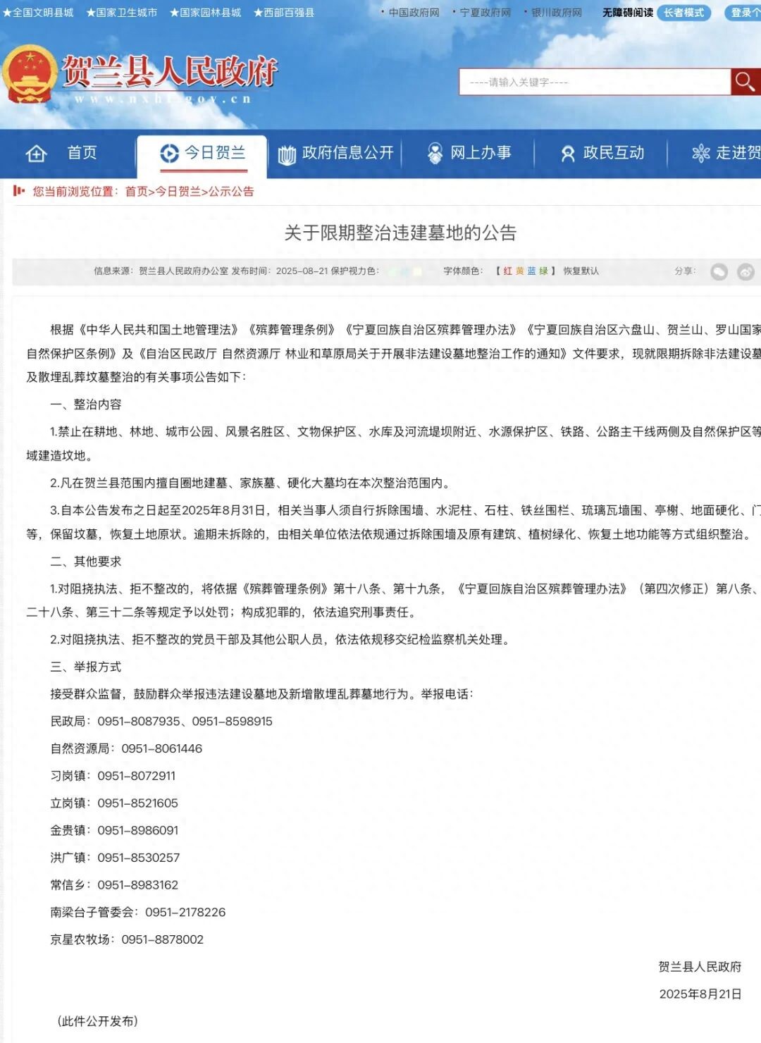 对此,4月3日,贺兰县人民政府工作人员对中国新闻周刊表示,当地政府曾于2025年8月21日发布了《关于限期整治违建墓地的公告》。公告提到,禁止在耕地、林地、城市公园、风景名胜区、文物保护区、水库及河流堤坝附近、水源保护区、铁路、公路主干线两侧及自然保护区等区域建造坟地。凡在贺兰县范围内擅自圈地建墓、家族墓、硬化大墓均在本次整治范围内。