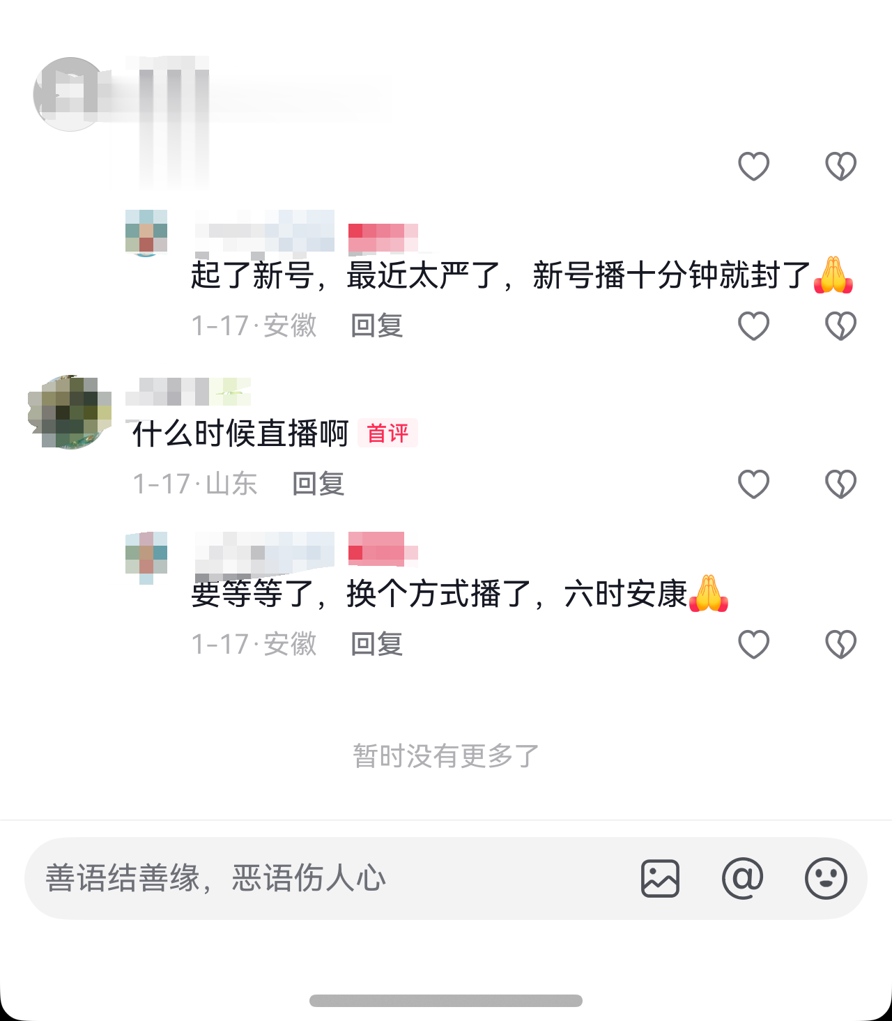 记者发现,当前平台对这类放生直播管控力度持续加大,不少放生博主却备有多个账号,试图跟平台“打游击战”。有放生博主发短视频称自己被平台限制直播,网友在视频评论区支招“换新号开播”,该播主回复称,“起了新号,最近太严了,新号十分钟就封了。”