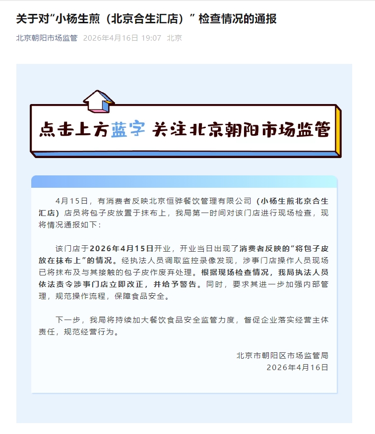 新京报讯据北京朝阳市场监管消息,4月15日,有消费者反映北京恒骅餐饮管理有限公司(小杨生煎北京合生汇店)店员将包子皮放置于抹布上,我局第一时间对该门店进行现场检查,现将情况通报如下: