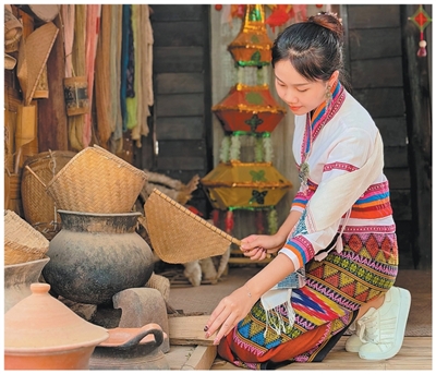 身着老挝传统服饰的妇女在“萤火工坊”体验纺织工艺。