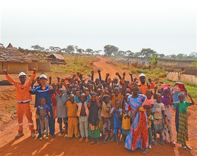 当地民众与项目建设者在连接起几内亚凯鲁阿内省孔桑科罗市与达马罗市的新建公路上合影。