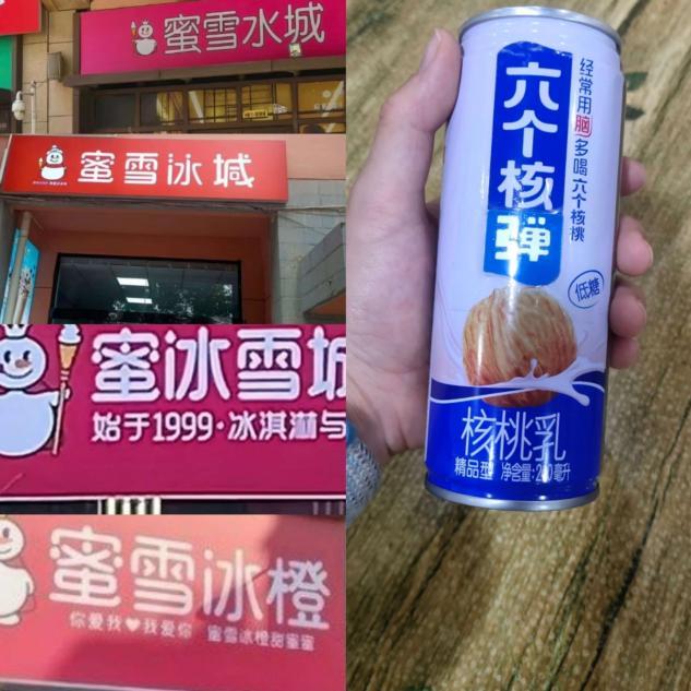 蜜雪冰城火遍全国,就有山寨商家造出“蜜冰雪城”“冰雪蜜城”“蜜雪水城”;六个核桃也没能幸免,被改成“六个核弹”,消费者拿起饮料时,恐怕不是想喝,而是被名字吓一跳。