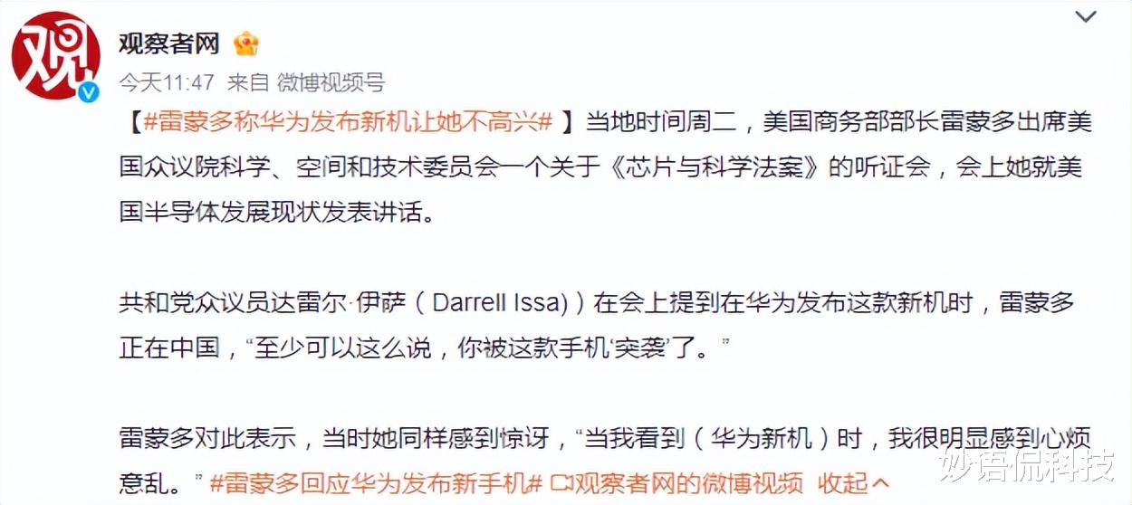 华为开售Mate60Pro的时间就是雷蒙多访华的时候,不少人觉得这是对雷蒙多的“贴脸开大”。雷蒙多曾警告华为,让他不要继续投入高科技研发,不然就展开更严厉的制裁。