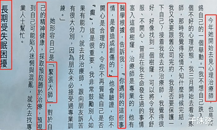 因为郑欣宜罢工公司只能用生病的借口向第三方解释,毕竟对方此前曾因精神问题求医,郑欣宜称自己失眠焦虑、情绪波动大,影响到了精神,只能暂停工作去看心理治疗师,通过此法解压。