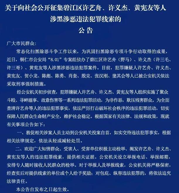 据铜仁市公安局微信公众号9月7日发布的公告,常态化扫黑除恶斗争工作以来,为巩固扫黑除恶专项斗争行动取得的成果,近日铜仁市公安局“8.01”专案组侦办了碧江区许艺舟(野马)、许义杰(许三毛、许三哥)、黄宪友等人涉黑涉恶违法犯罪案件。