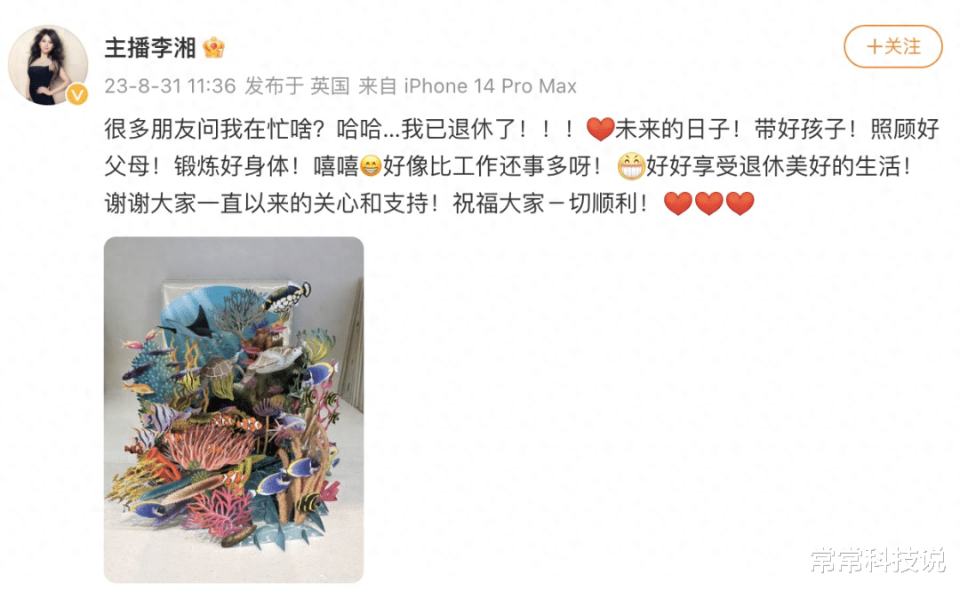 2023年8月31日,47岁的李湘在社交媒体上宣布退休。