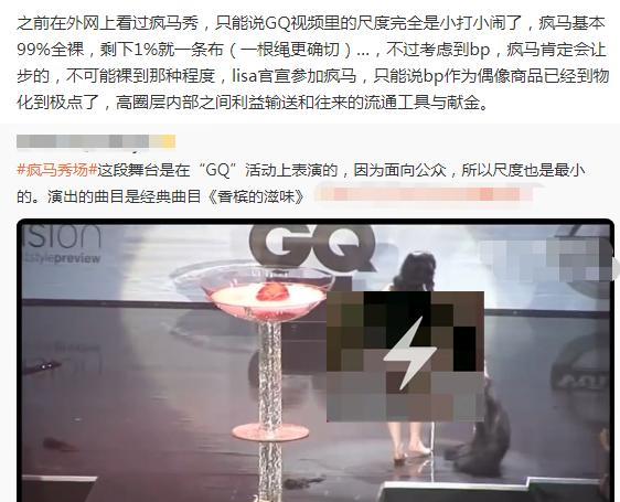“lisa参加疯马秀最严重的影响是上万甚至上百万的未成年人知道了疯马秀这个东西,他们会好奇会搜索会观看这个影响是不可逆的。她最大的错不是参加而是传播,特别是让小孩子们了解了这个东西。”
