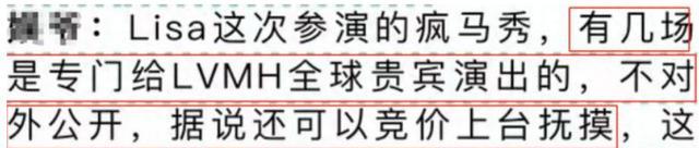 知情人士曝出,Lisa参加的5场疯马秀表演,有几场是专门给LV集团旗下全球贵宾,也就是VIP们准备的,不对外公开。Lisa表演完毕,VIP们可以参与竞价,达到要求的能上台任意抚摸Lisa,这才是粉丝最无法接受的地方。