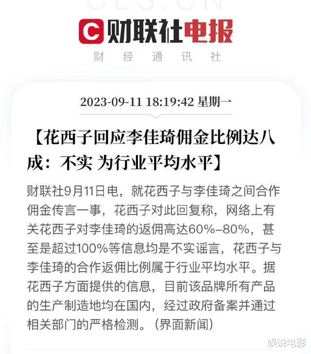网友表示李佳琦在花西子的提成是80%,目前品牌方表示会调查,但没有肯定这件事。目前花西子品牌方回复媒体,关于李佳琦的返佣都不是真实的,均属谣传,花西子与李佳琦的合作返佣比例属于行业平均水平。