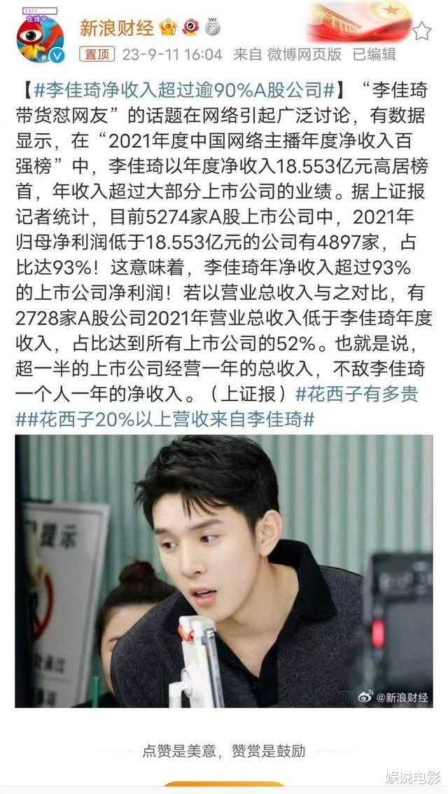 李佳琦的确非常有钱,他的净收入超过了90%的A股公司。2021年李佳琦以年度净收入18.553亿元高居榜首,年收入超过大部分上市公司的业绩。5274家A股上市公司,利润低于18.553亿元的公司有4897家,占比高达93%。以营业总收入与李佳琦公司比较,有2728家A股公司2021年营业总收入低于李佳琦年度收入,占比达到所有上市公司的52%。也就是说超过一半的上市公司经营年度总收入,不敌李佳琦一个人一年的净收入。