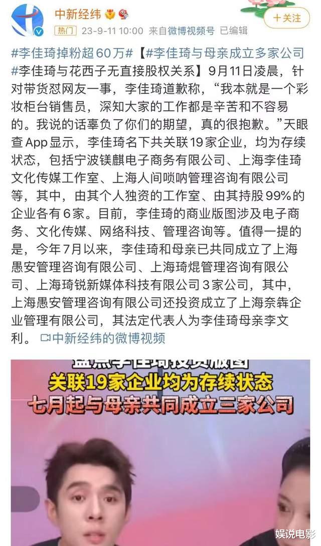 李佳琦和母亲还成立多家公司,名下关联的企业高达19家,均为存续状态,这些公司中由其个人独资的工作室,由其持股99%企业各有6家。商业版图涉及电子商务、文化传媒、网络科技、管理咨询等。