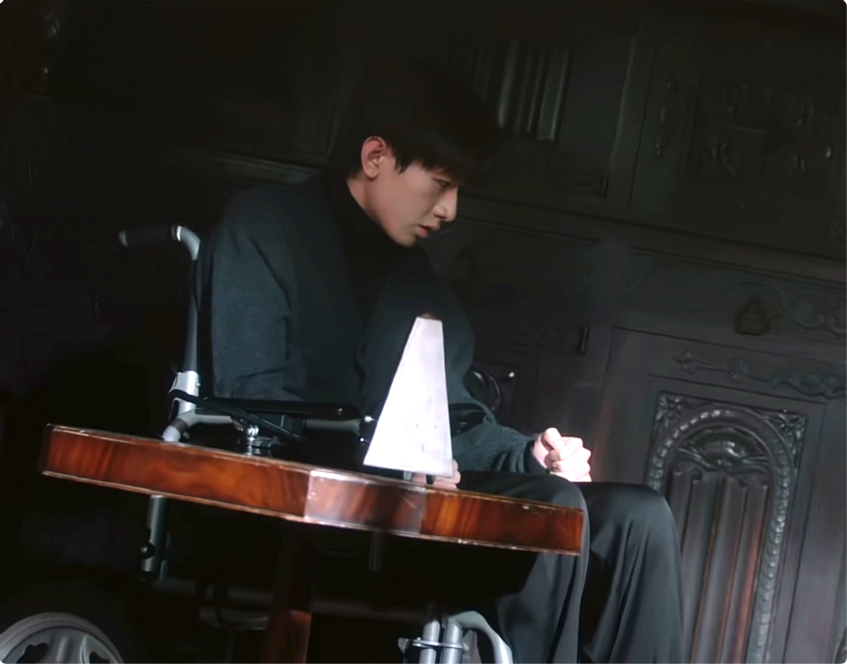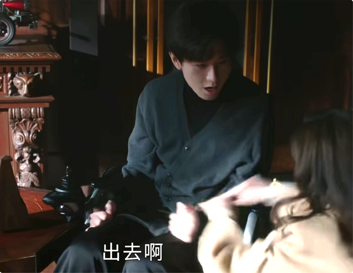 男主傅云深(成毅饰)在黑暗的房间里坐在一架轮椅上,沉重的家装,衬得成毅的面庞更加清瘦苍白。