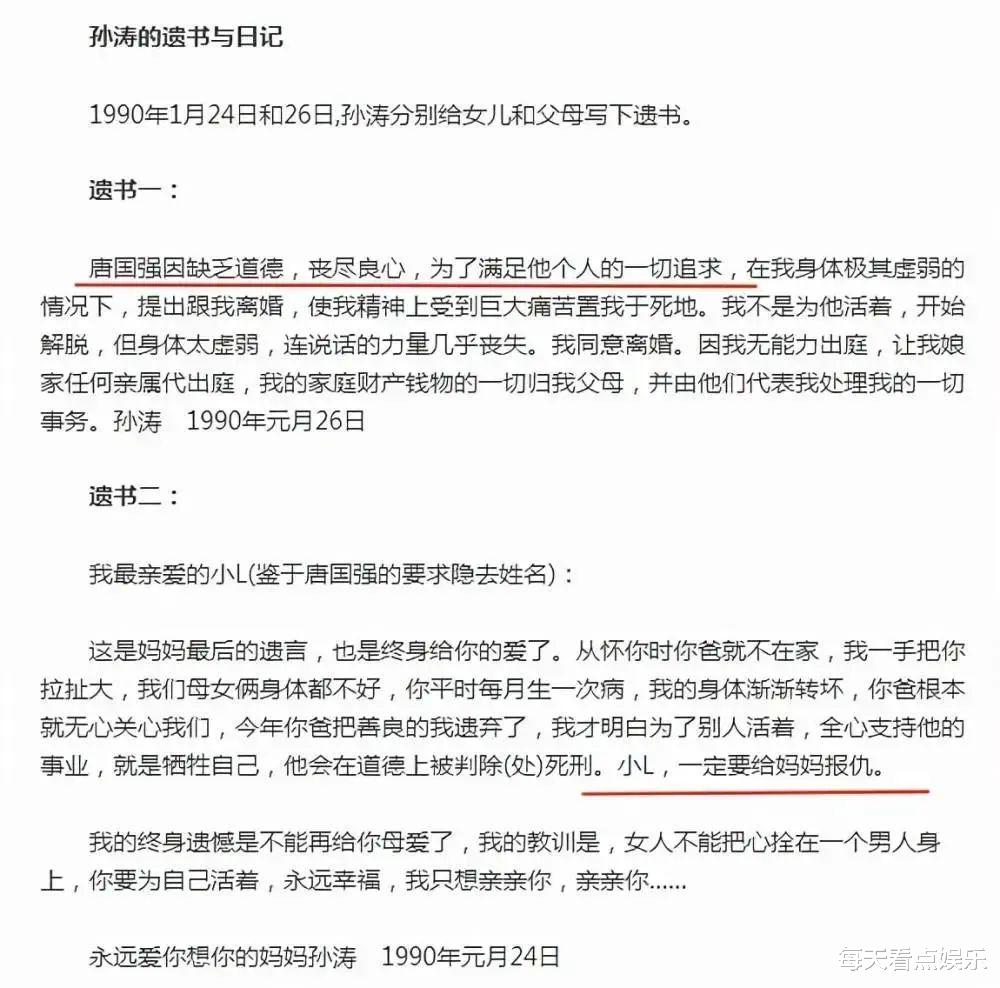 1990年除夕夜,唐国强的妻子孙涛在娘家的卫生间自缢身亡,留下两封遗书和7岁的女儿唐莉。