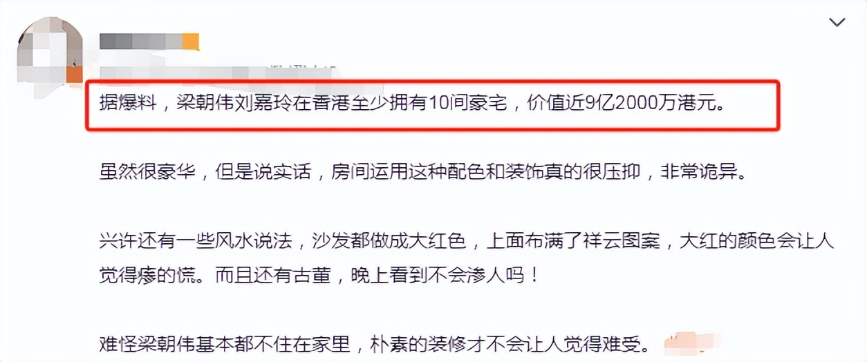 有网友表示,这座房子看着就恐怖,更别说是住人了。有网友表示,这种风格属实是欣赏不了,但是那种朴素淡雅正常的装修风格,舒服点。刘嘉玲在这座豪宅装修时应该想要那种偏中式风的装修风格,就是误打误撞成了这样。