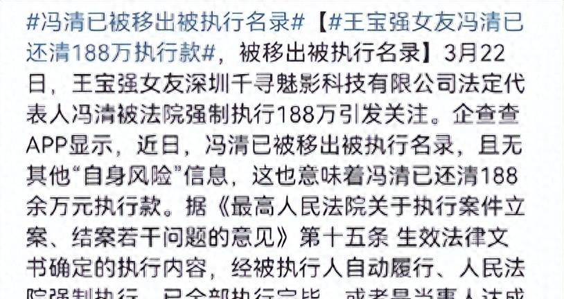 近日,冯庆阿的公司出现了近200万元的债务纠纷,正是王宝强帮她还清了债务。这充分体现了王宝强对冯庆的信任和支持。