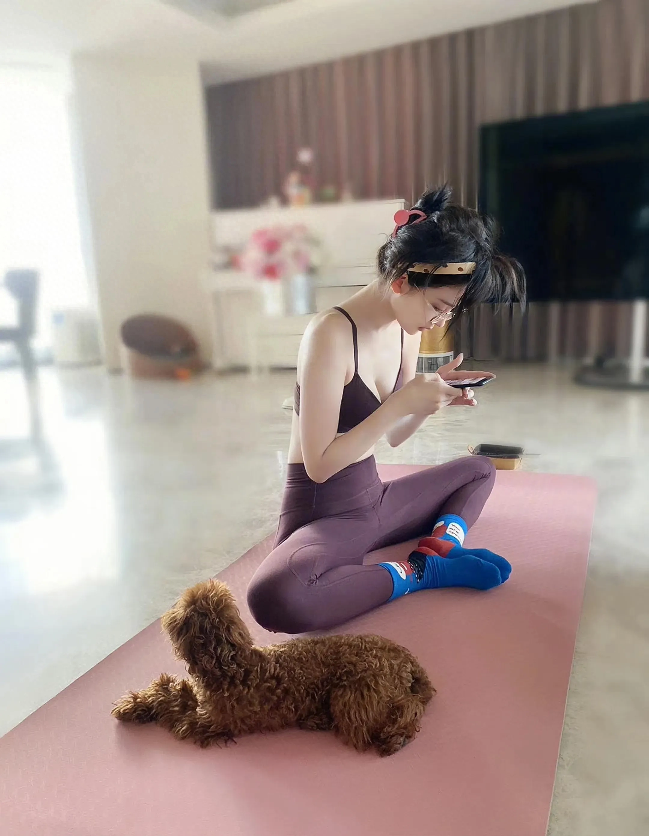 她的瑜伽服造型,虽然凸显了自己修长的双腿,但也暴露了自己过于单薄的身型。