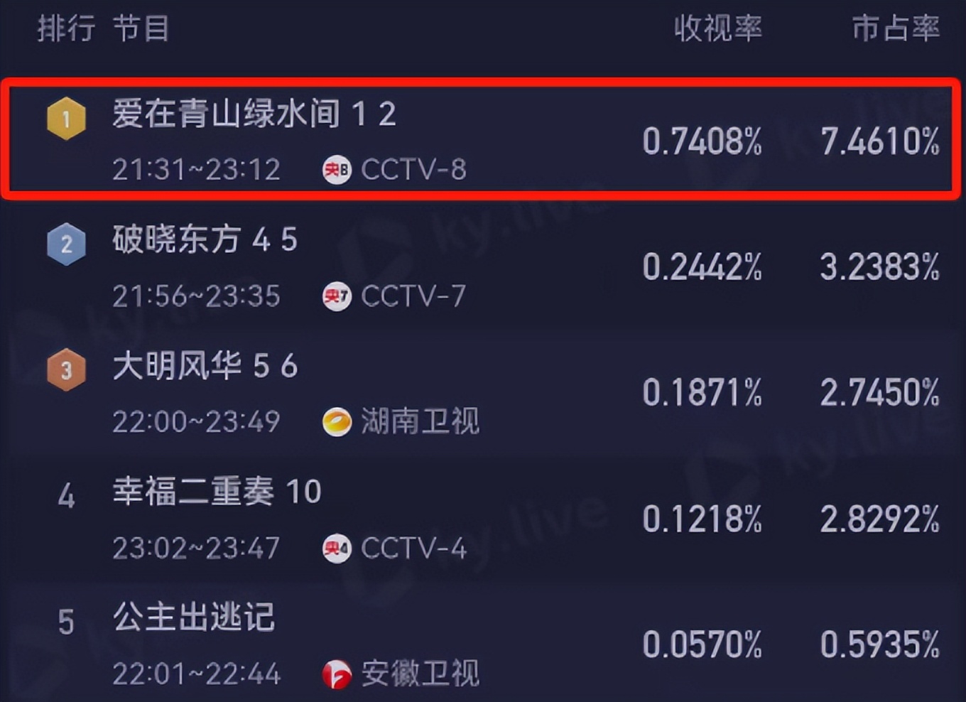 《爱在青山绿水间》上星央八后黄金档,首日仅放出两集,直接登顶收视率排行榜,吊打一切同期作品。