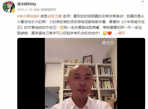 她生病的事情在网上曝光之后,跟她没有合作过、但认识一个共同的制片人的张卫健得知后专门给她录制了视频加油打气。