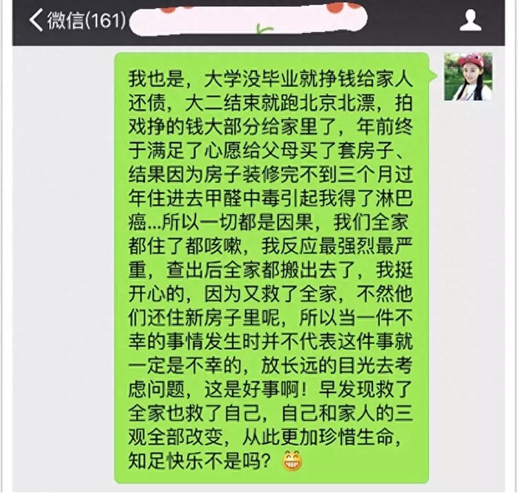 她去世后有很多关于她父母压榨她的新闻,不知道报道是不是属实,但从她在微博上分享的鼓励病友的经历来看,她真的是半生都在为父母而活,打工为父母还债、买房,最后生病很大程度上也是因为那套房。