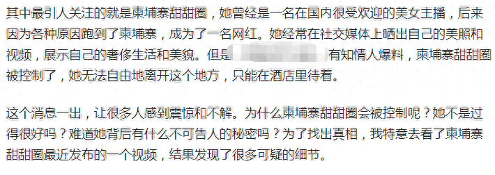 并且这位爆料的人直言,甜甜圈现在已经被囚禁,被人关在了酒店,而且他永远离不开柬埔寨了,得知这一消息的网友,纷纷为甜甜圈感到担心。