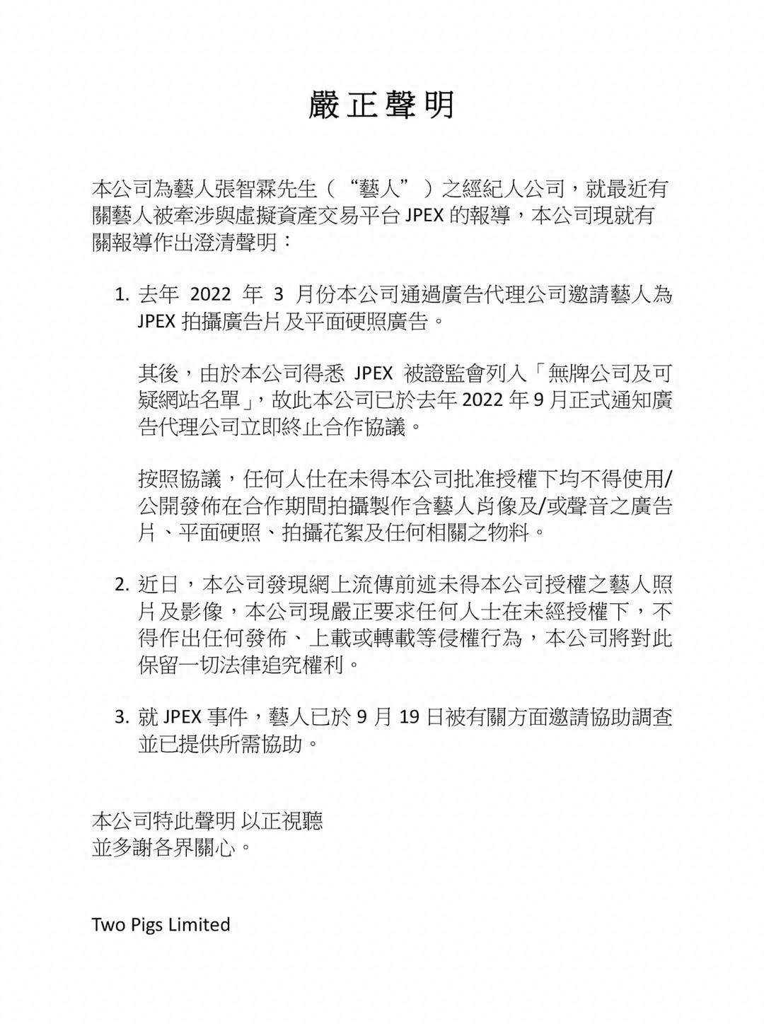 他先是在网上发布自己总结的时间线,声称早在2022年九月份就和公司解除了合作关系,把责任撇的是一干二净,对后面为什么公司仍继续使用张智霖的形象做宣传就开始装傻充愣。