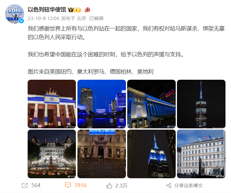 一、以色列驻华使馆发各国灯光秀声援图,呼吁中国网友给予支持