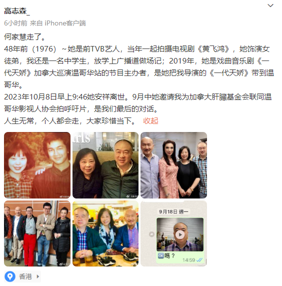 10日凌晨,导演高志森发布透露,前TVB艺人何家慧在8日上午9时46分安详离世,上个月曾邀请他参加相关活动,特别提到是“肝臟基金会”,猜测何家慧的死因与肝脏疾病有关。