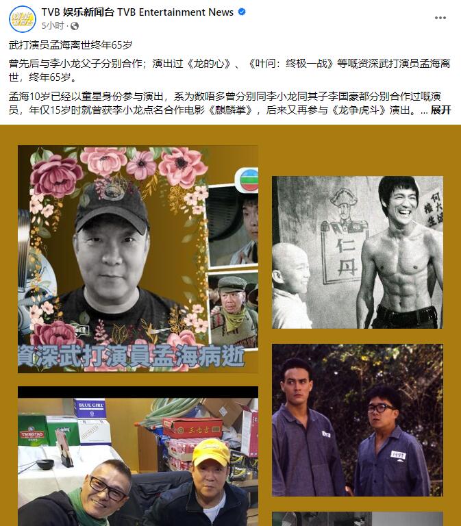 另据香港无线10月10日报道,著名演员孟海于10月9日病逝,享年65岁,圈内友人杜大伟、卢惠光发文悼念。