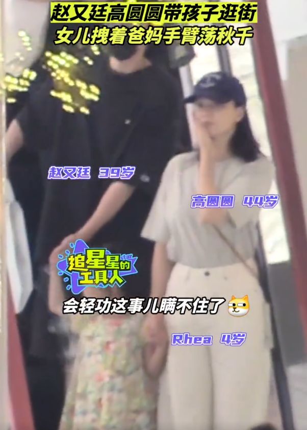 10月12日,娱记拍到高圆圆和赵又廷带着女儿逛街的视频,视频中一家三口手牵手,全都素颜出门,一路上夫妻俩不时聊天讨论,似乎是在商量要买什么。而4岁的Rhea左右牵着父母荡秋千十分可爱,看得出是个性格十分活泼的小姑娘。