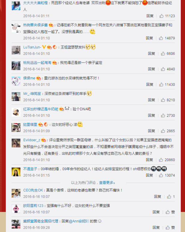 当时有网友称:“你出轨,我们可以接受!你不爱王宝强,可以选择离婚,我们也可以接受!如果没有王宝强,我们根本不会认识你马蓉是谁!但你出轨王宝强的经纪人宋喆,这却是无法让人原谅的!王宝强,把你当亲人,把宋喆当兄弟,你们俩“乱伦”搞到了一起,实在是有违天意,大煞风景!”