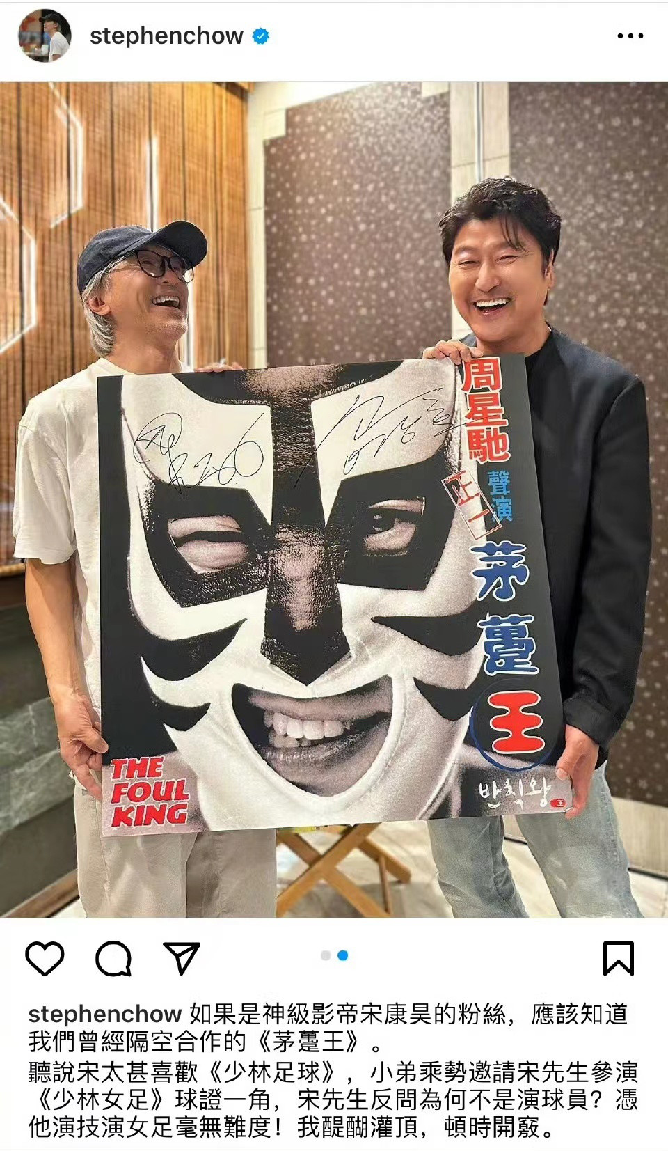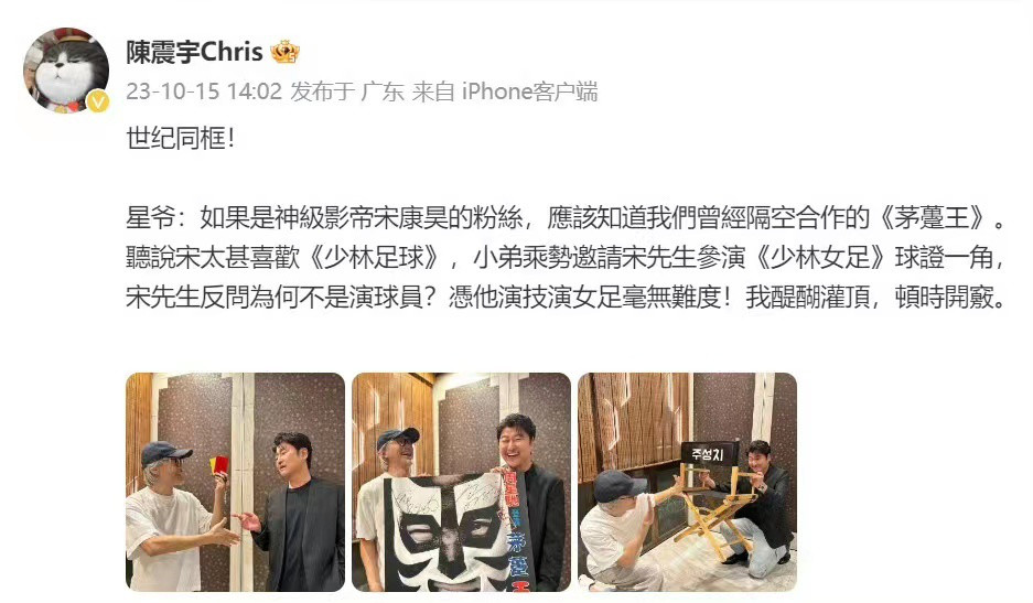 影帝宋康昊加盟周星驰《少林女足》 作者: • 更新时间:2023-10-17 01:00 • 10月15日,导演周星驰在社交平台发文,透露韩国演员宋康昊将加盟其新片《少林女足》,并饰演裁判一角。随后,周星驰的经纪人陈震宇也发文感慨“世纪同框”,难掩喜悦激动。 本文内容由互联网用户自发贡献,该文观点仅代表作者本人。如发现本站有涉嫌抄袭侵权/违法违规的内容,请发送邮件至 203304862@qq.com 本文链接:https://jinnalai.com/yule/389446.html