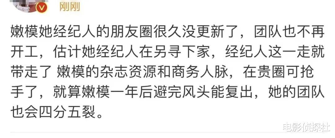 据圈内人透露,自杨颖翻车之后,杨颖的经纪人已经很久没有更新朋友圈了,而她的团队也不会再开工,经纪人这一走,不仅代表着团队解散,更是带着本该属于杨颖的杂志资源和商务人脉离开了,即便避过了这阵子的风头,杨颖的团队也早就四分五裂了,想要翻红怕是难上加难。