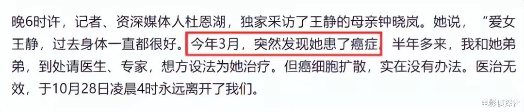 据悉,王静是在今年3月份的时候查出癌症,从发病到现在一家人到处求医,但是癌细胞扩散太快,半年的时候就医治无效,永远离开了人世间。