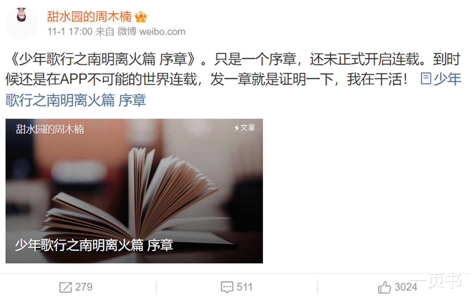 而更为令人激动的是周木楠在11月1号又更新了小说,这部小说就是《少年歌行之南明离火》的序章,并且表示自己更新这个章节就是为了证明自己在干活。而这部《少年歌行之南明离火》就是《少年歌行2》,也就是萧瑟、无心、雷无桀等离开了天启之后发生的故事。