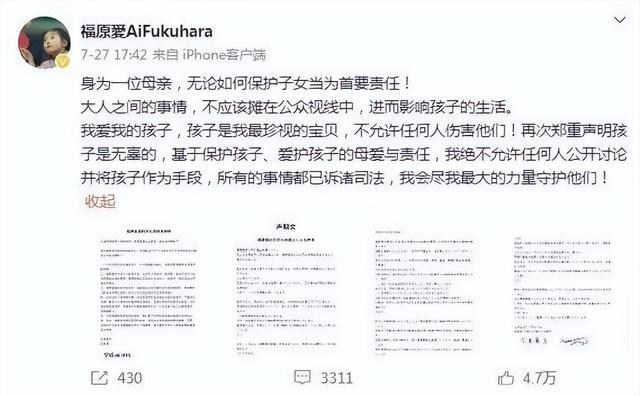 福原爱说,孩子是无辜的,基于保护孩子、爱护孩子的母爱与责任,“我绝不允许任何人公开讨论并将孩子作为手段,所有的事情都已诉诸司法,我会尽我最大的力量守护他们!”