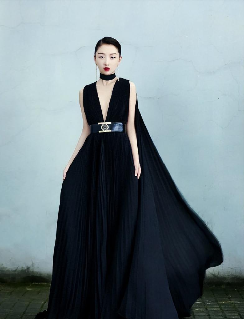 上半年的电影盛典红毯上,一袭深V黑色吊带裙;
