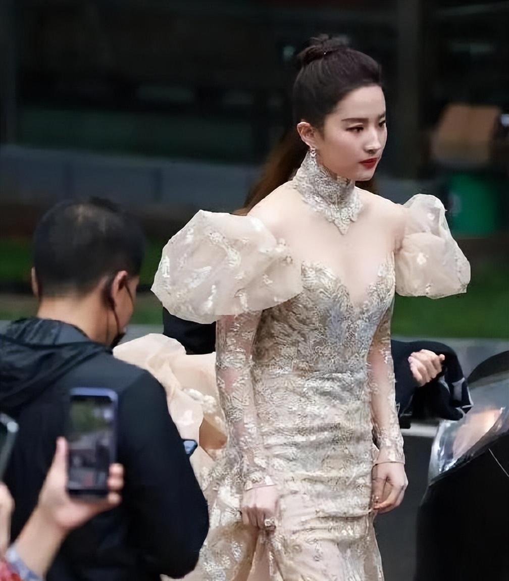 出席活动走红毯时,高定的礼服却直接暴露了刘亦菲的溜肩。