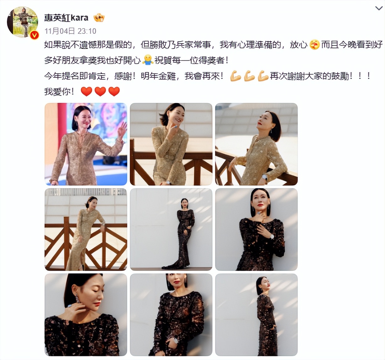 至于本届影后呼声最高的惠英红,在网上坦白自己的遗憾之情,但在镜头前却给了何赛飞这个对手最真诚的敬意。
