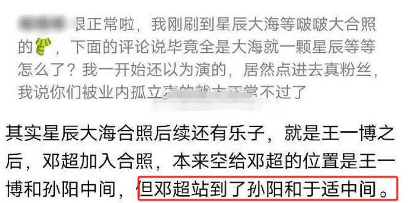 紧接着还有人声称在最后合照中,原本邓超是要站在王一博与孙阳中间,却不知道为什么换到了于适跟孙阳中间,一时间不知道到底是谁在孤立谁?