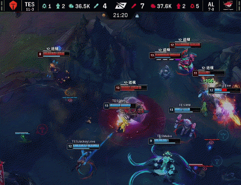 [33:36]TES去开大龙,AL过来骚扰,赵信进人群捅死卡莉丝塔,阿卡丽融化安妮,韦鲁斯反手在再杀阿卡丽又杀妮蔻,AL打出1换4收掉大龙,经济反超1k并听牌炼金龙魂。