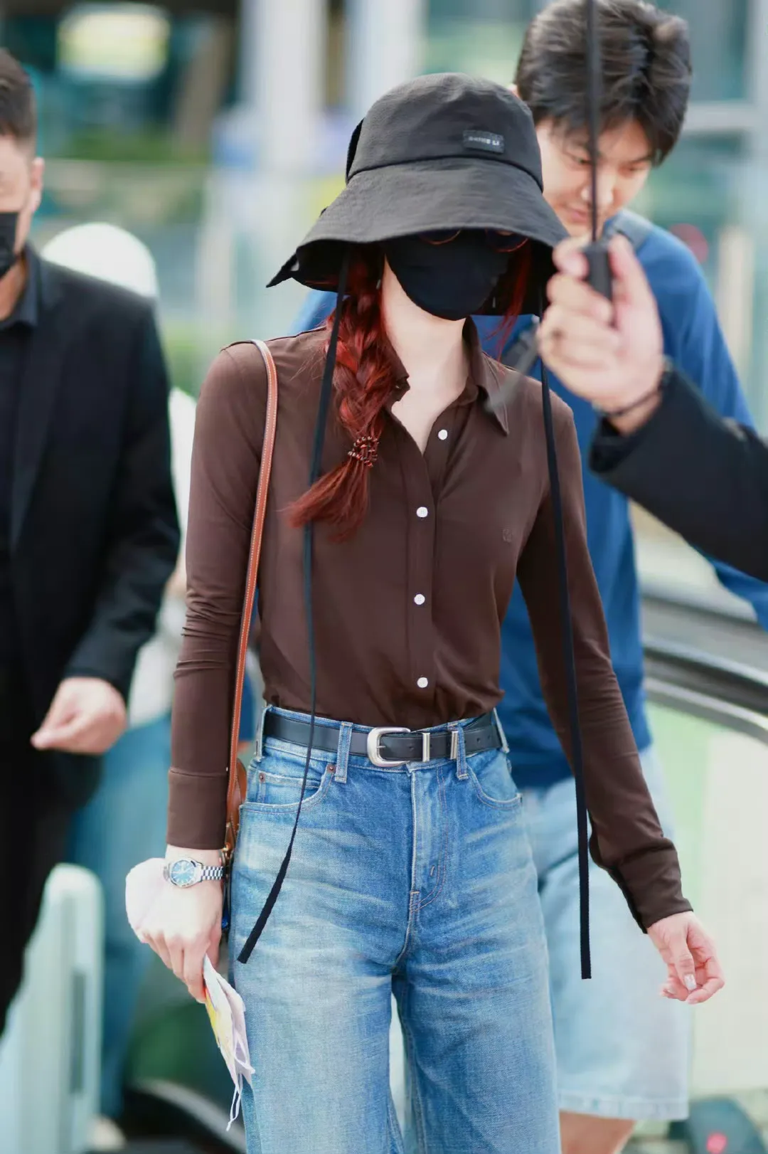 刘诗诗现身机场时,头戴渔夫帽,巧妙地遮住部分脸庞,增添了一丝神秘的气息。一头红色单扎马尾辫从帽子后孔中穿出,随着她的步伐轻轻摆动,既醒目又充满活力,打破了她以往给人的温婉印象,展现出酷飒的一面 。