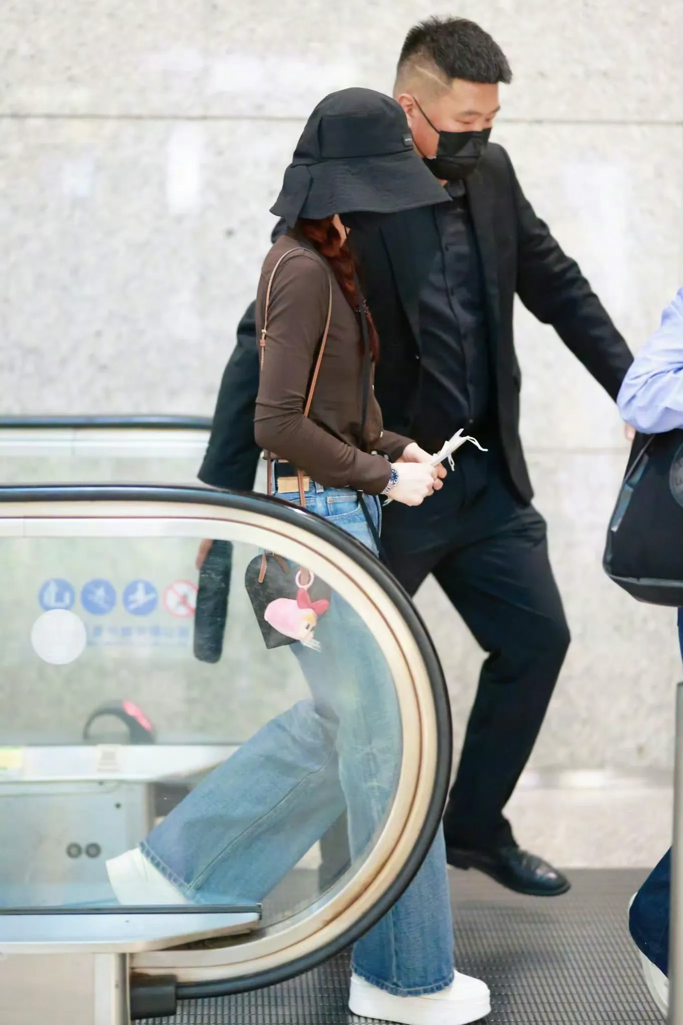 棕色心形单肩包作为整个造型的点睛之笔,与棕色衬衫相呼应,形成了统一的风格。心形的设计则为整体造型增添了一份俏皮可爱的感觉,展现出刘诗诗温柔甜美的一面。单肩背的方式让她在行走间更显随性自在,无论是赶飞机还是日常出街,都十分方便实用。