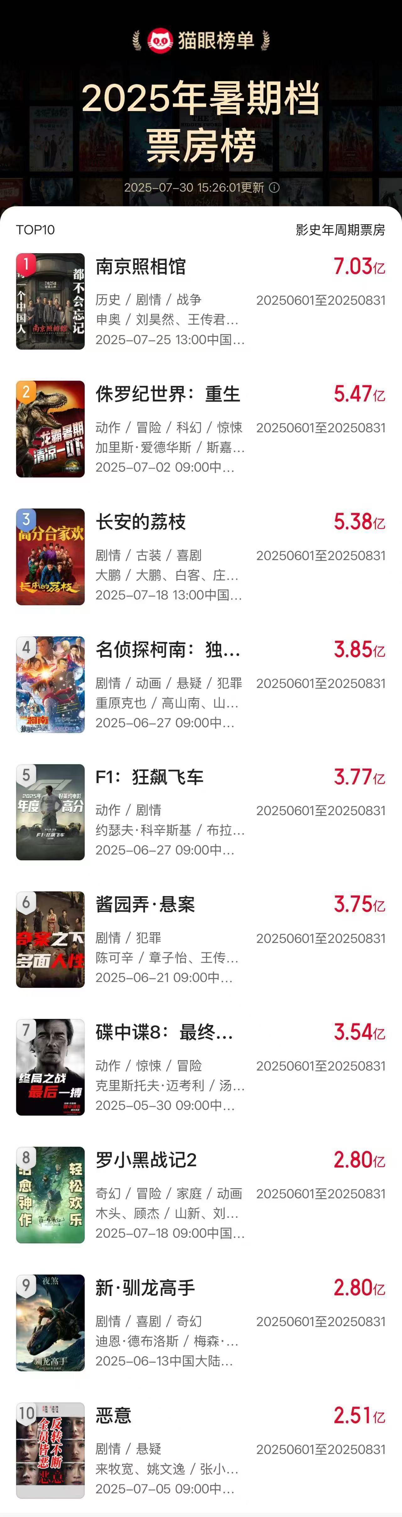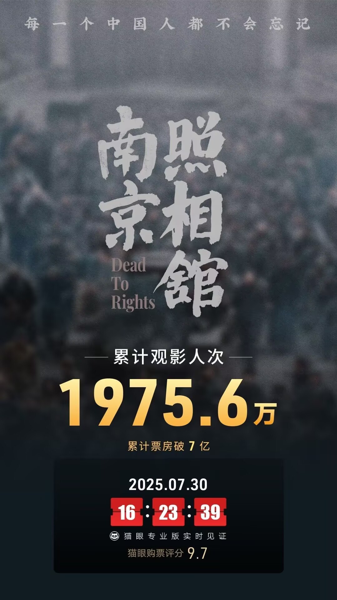 据猫眼专业版数据,截至7月30日16时23分,电影《南京照相馆》上映6天票房突破7亿,进入2025年度票房榜前五,领跑2025年暑期档票房榜。