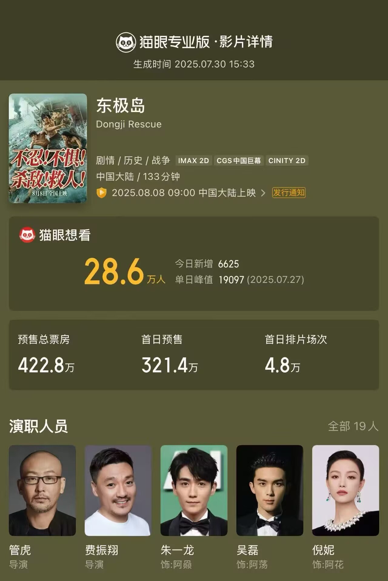 此外,暑期档另一部抗日大片《东极岛》登顶暑期档实时想看榜。截至当前累计猫眼想看数28.6万,预售总票房422.8万,影片将于8月8日上映。