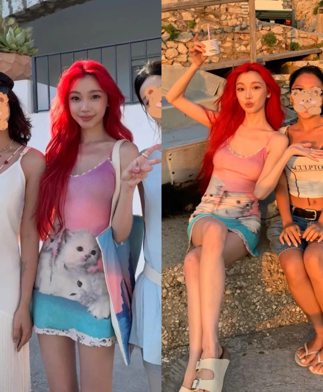 私下度假可以变身粉嫩的美人鱼了!粉色猫咪吊带,搭配拖鞋,真的很梦幻!
