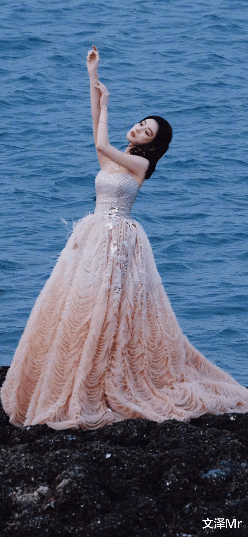作为压轴,礁石舞台重现,孟子义盘起秀发,双臂舒展向上抬,身姿曼妙如海浪起伏。这袭浅粉长裙设计极尽奢华:裙身细腻褶皱如涌动的潮汐,抹胸设计精致勾勒肩颈线条,拖地裙摆在风中翻飞,点缀的闪亮装饰宛如海面星光。她的颜值与身材完美融合:微微后仰的头部与魅惑眼神,勾勒出一种海洋女神的戏剧张力,红唇如点睛之笔,将整个造型升华至浪漫巅峰。这段姿态呼应她作为演员的成长经历——一路从青涩演员到成熟艺人,她始终以优雅姿态征服镜头,正如这身穿搭般,将时尚与自信化为个人符号。
