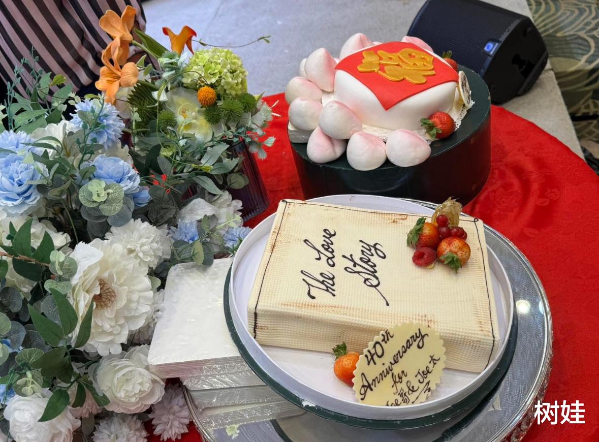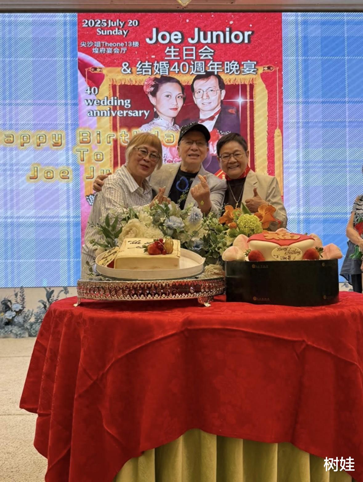Joe Junior的生日宴以及红宝石婚庆在尖沙咀的The One13楼的煌府宴会厅举办,现场没有特别布置,主要是以晚宴为主。不过在主席台后的大荧幕上,晒出了Joe Junior与太太年轻时候的照片,同时还滚动播放了夫妻俩一路过来的各种日常生活照。40年前的婚照被公开在大荧幕上,那时候Joe Junior还年轻,他的样貌至今都没有太大的变化,一眼还是能认出他。而他的太太年轻的时候可漂亮了,照片中,她穿着裙褂,头上戴着大红花,不过对比起今天的样貌,仿若已经是另一个人,完全就不是相片中的人,好在两人的感情没有变。