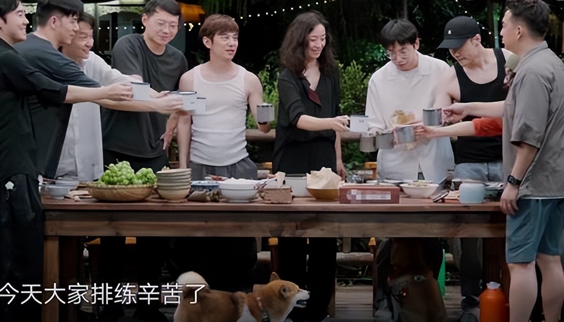 之后众人齐聚,黄磊端着领导派头让大家举起杯:“今天大家排练辛苦了”。